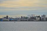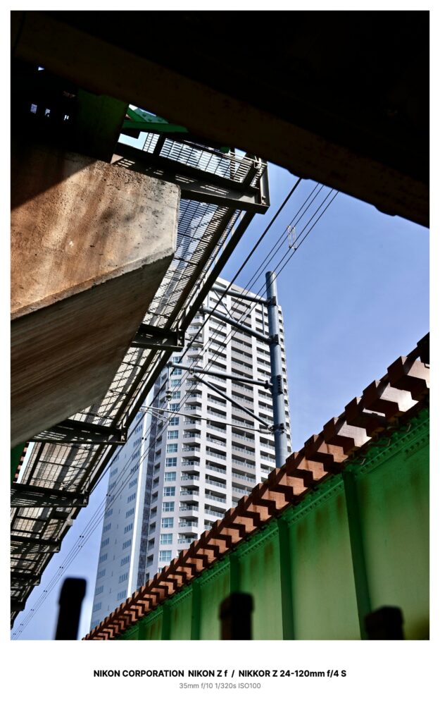 高架下から見上げると、白い高層マンションの窓が並んでいた。