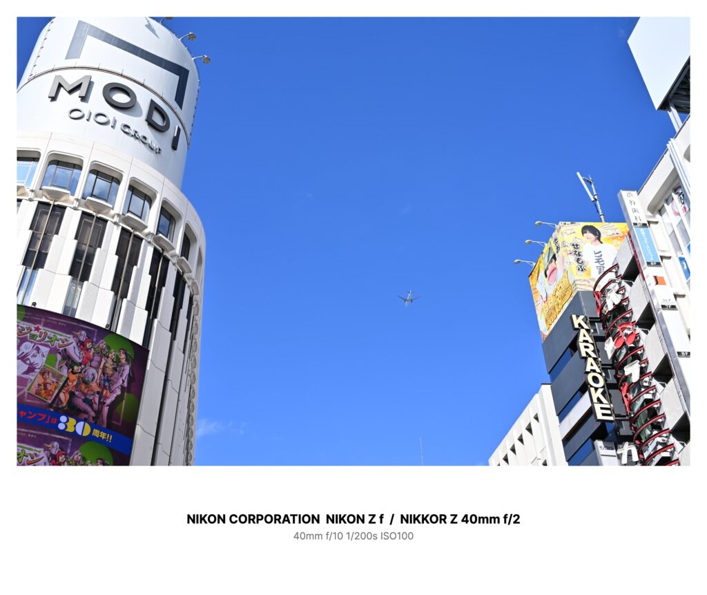 白い円筒のビルの上面と、黒い縦の「KARAOKE」の看板のあいだ――ちょうど真ん中の空に、小さな飛行機が浮いていた。浮いて、いた。進まない。音だけが、街の雑踏に混じって一定の高さで鳴り続けている。