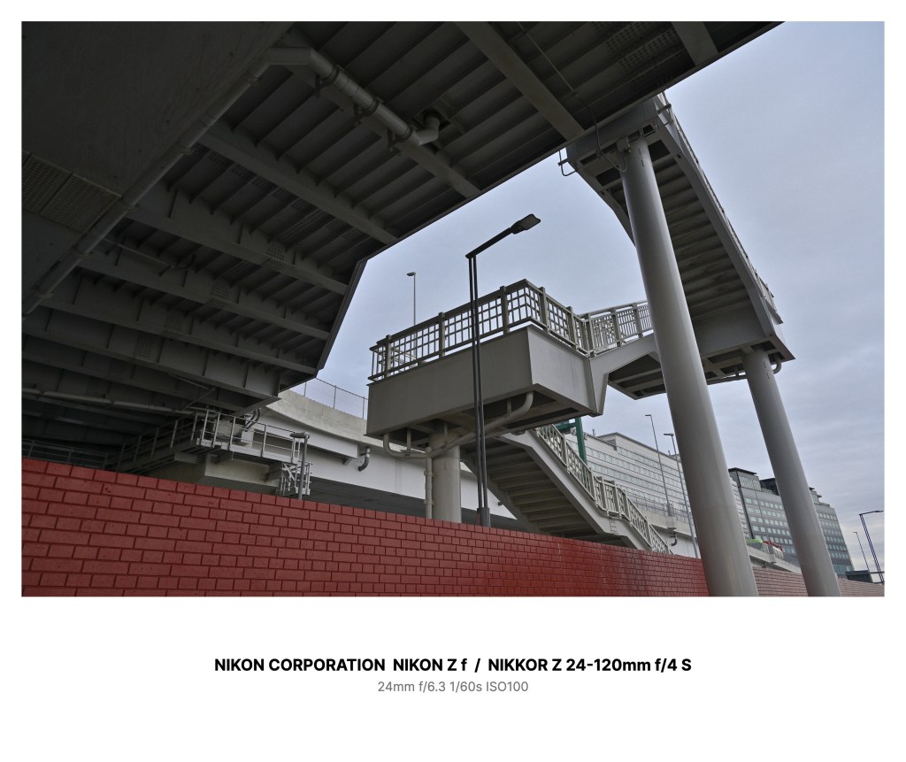 踊り場だけが宙に取り残され、そこへ伸びる街灯が、まるで足場を示す指のように斜めに突き出ている。
