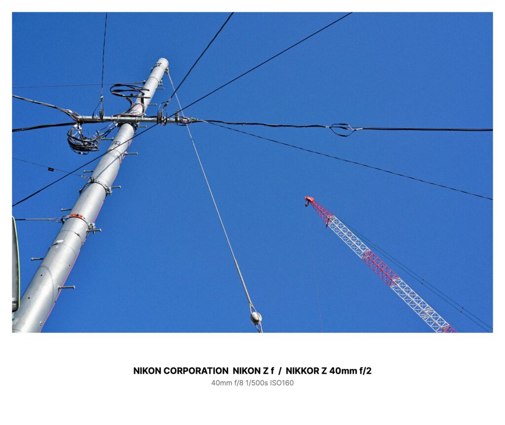新しい電柱から伸びる線と、別のビルから引かれた線、クレーンに仮固定された線が、ちょうど一点で交差している。その真ん中に、太いワイヤが輪になってぶら下がり、さらに余ったケーブルがぐるぐると巻き付いている。