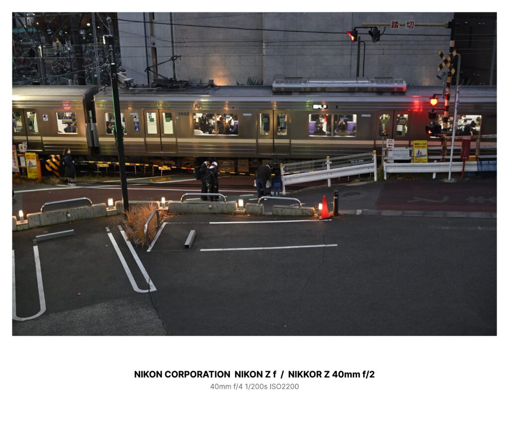 踏切の手前ではなく、その少し先――写真では空白に見える、電車の向こうの斜めの道路のあたりを。