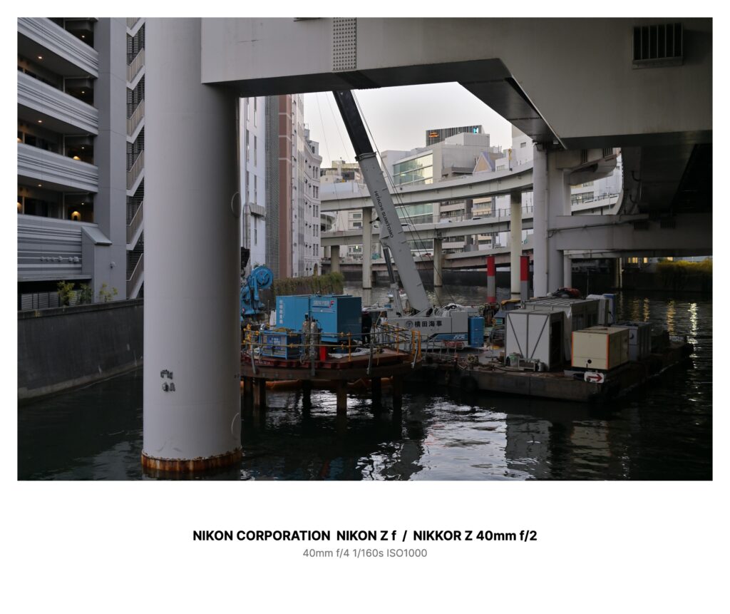 頭上には幾重にも重なった高架道路、その下を濁った水路がゆっくり流れている。コンクリートの柱と柱のあいだに、仮設の作業船が一隻、工事用の機械を積んで係留されていた。