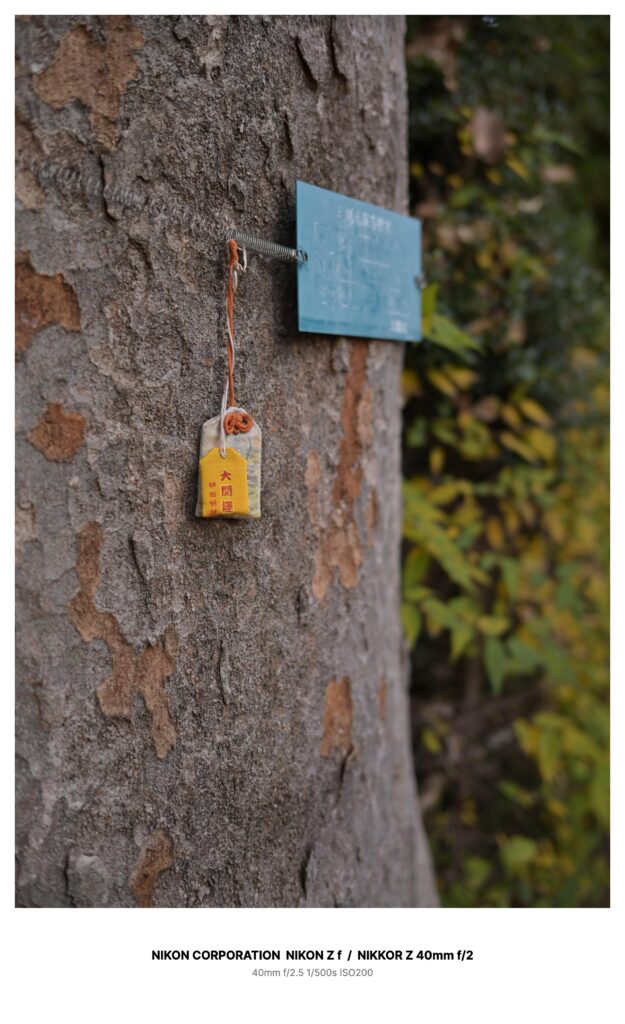 風が吹くたび、黄色いお守りが、ひゅるりと幹の前で揺れる。
