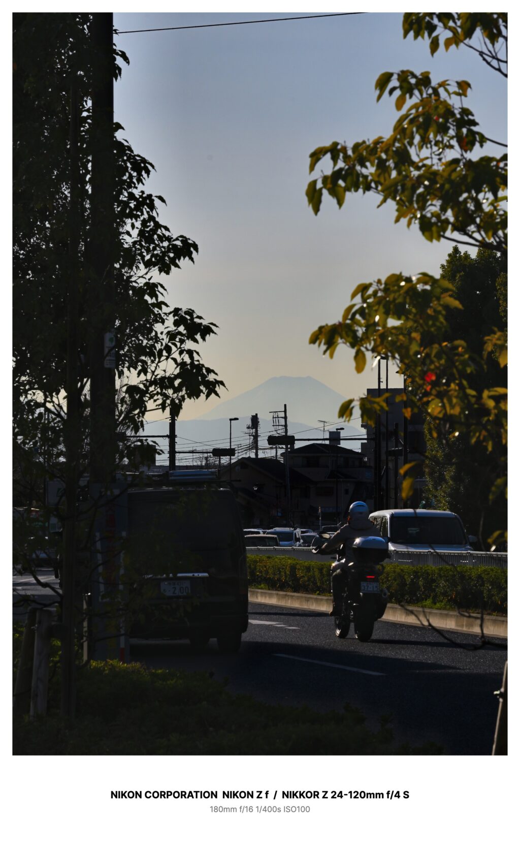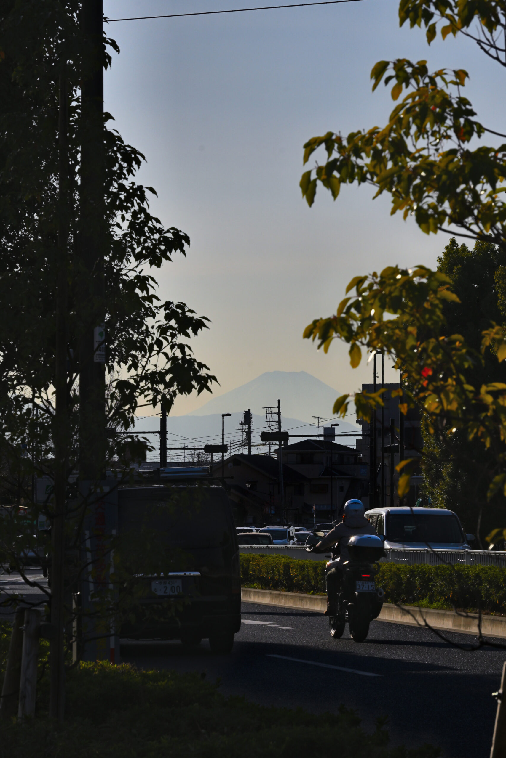 信号待ちの列の中、ふと街路樹のぼやけた葉に目をやると、葉の隙間から覗く富士の輪郭が、紙を切り抜いたみたいに鋭く見えた。