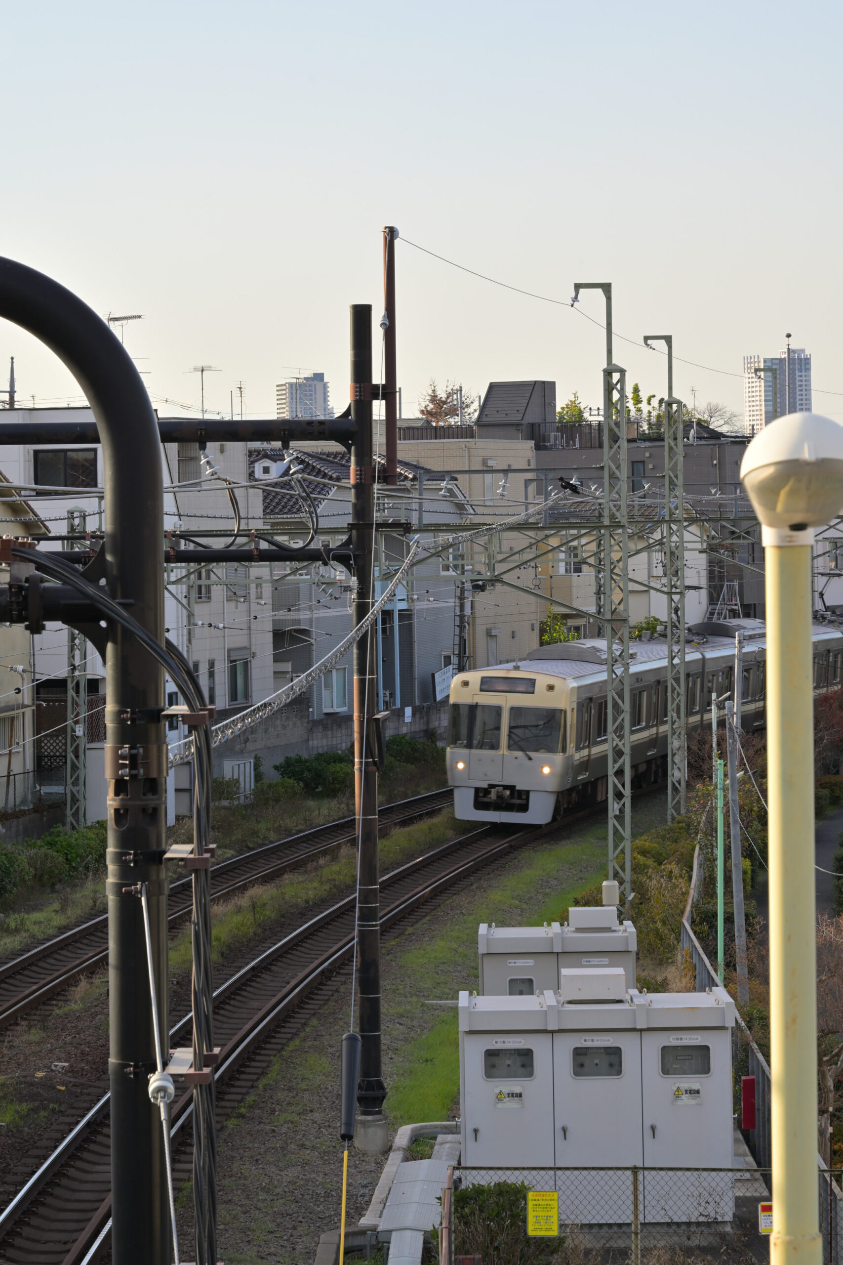 高架の小さな駅には、入口へつながる陸橋がある。線路を見下ろす位置にあって、住宅の屋根の高さと同じ目線で、電線と架線柱が複雑に絡み合うのが見える。夕方、空が白く薄まっていく時間帯は、街の輪郭だけが先に硬くなり、音だけが遅れてついてくる。