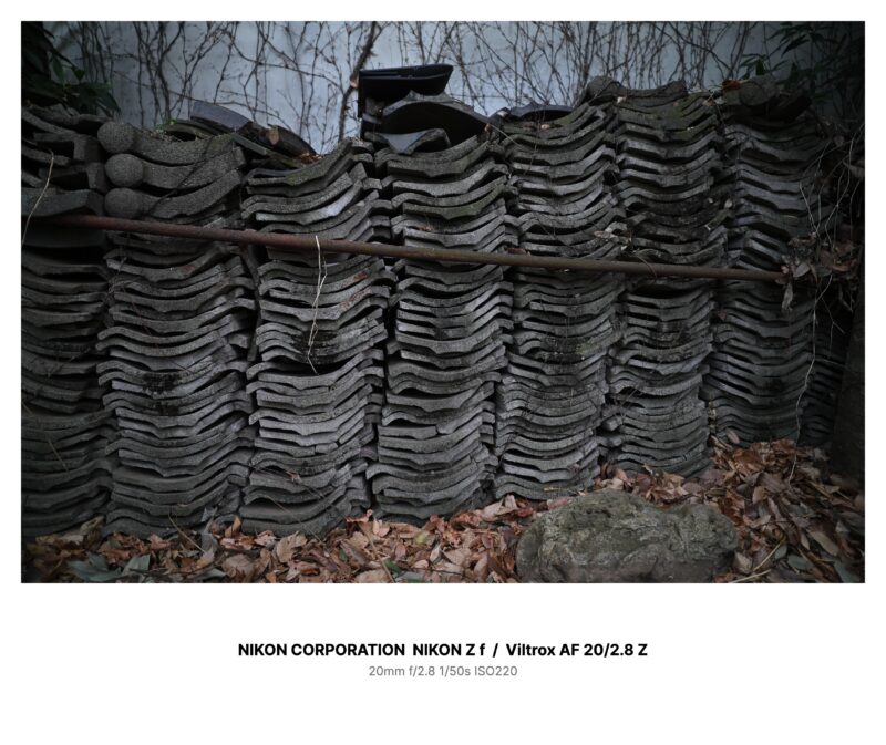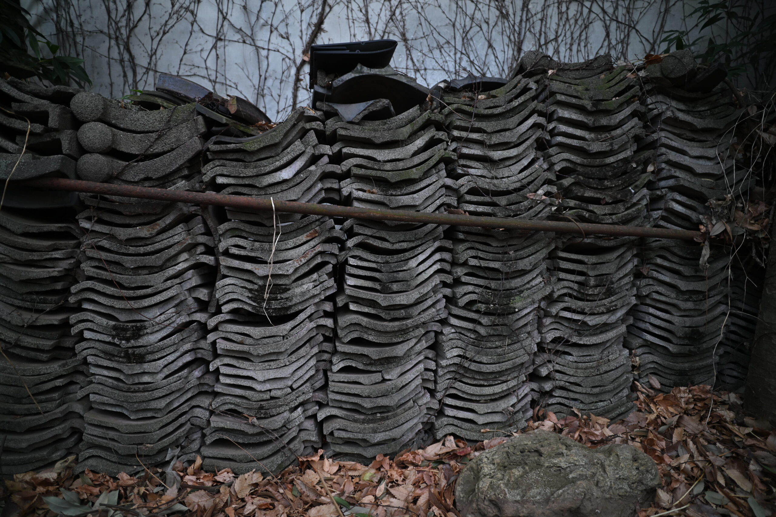 問題の瓦の山は、緑道の中央付近、柵で仕切られた片隅にあった。白い壁に枯れ蔓がびっしり絡み、瓦は波のようにうねって積まれている。表面は苔と煤けた灰色で、長い錆びた棒が、横切るように渡されていた。上には黒いゴムマットのゴミ。蓋みたいに、ぴたりと乗っている。