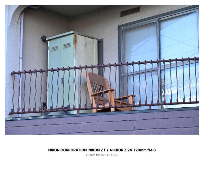 古い集合住宅の前を通りがかったとき、二階のベランダが目に止まった。波打った鉄柵の内側に、薄緑の物置ロッカーと、木製の椅子が一脚。使い古された木肌と錆の筋が、そこだけ時間を遅くしているように見えた。