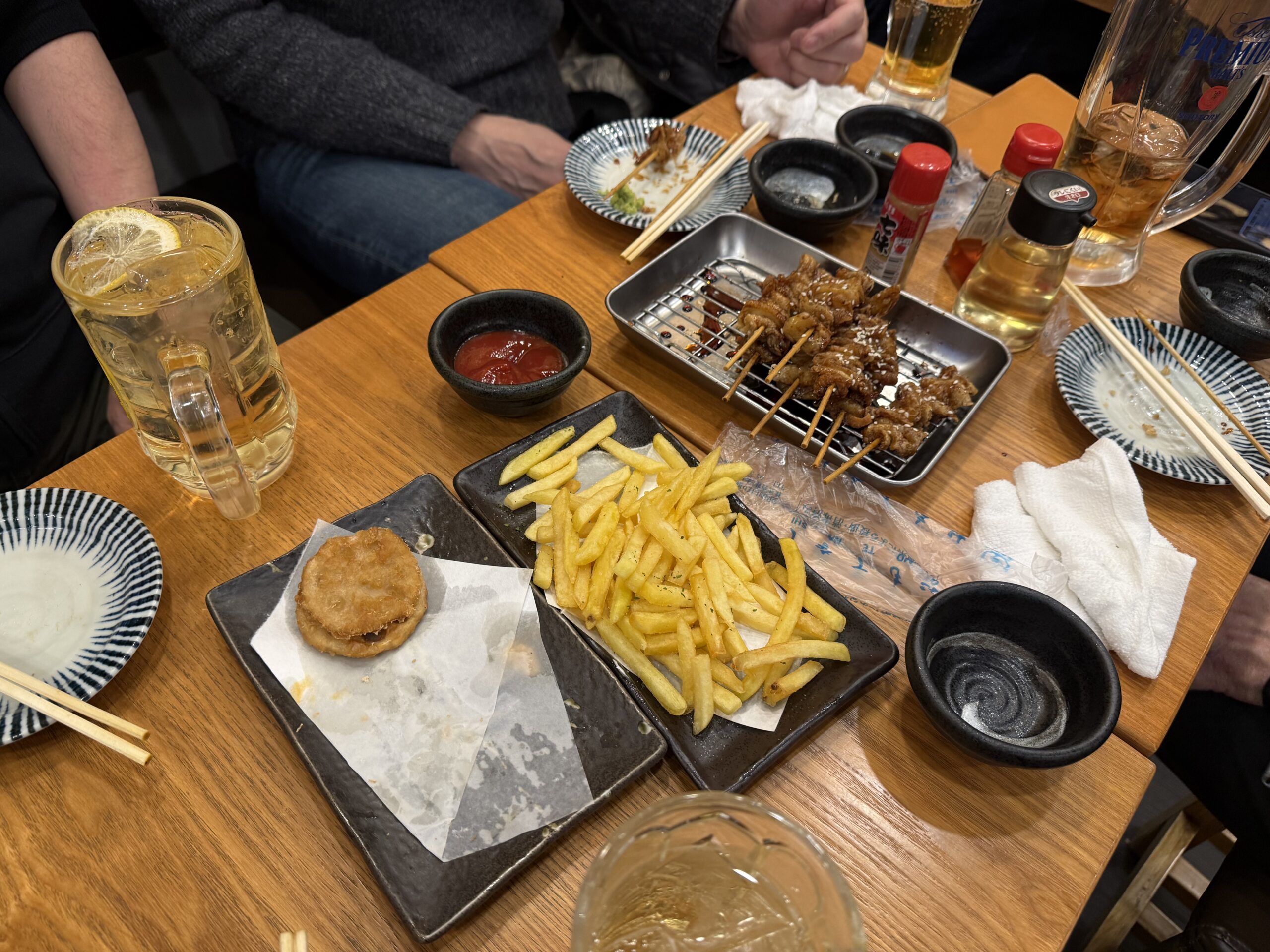 鶏皮の串が、金属のトレーに並んで運ばれてきた。照りのあるタレ。白いごま。脂の匂いが立ち上がって、腹の底が温かくなる。黒い角皿には山盛りのフライドポテト。小鉢の赤いケチャップは、照明の下で妙に暗い色をしていた。