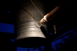 当夜、係の者は柵の内側に折り畳み椅子を置き、録音機のランプを確認してから数取り器を構えたそうです。鐘楼の柱には、古い掲示板が残っていて、そこにこんな説明が貼られていたといいます。