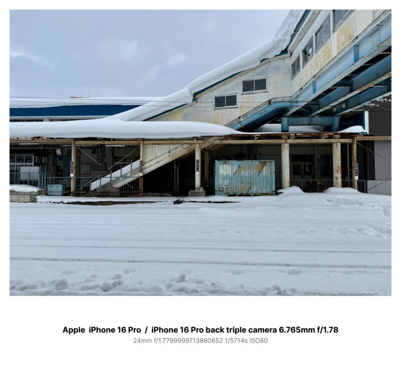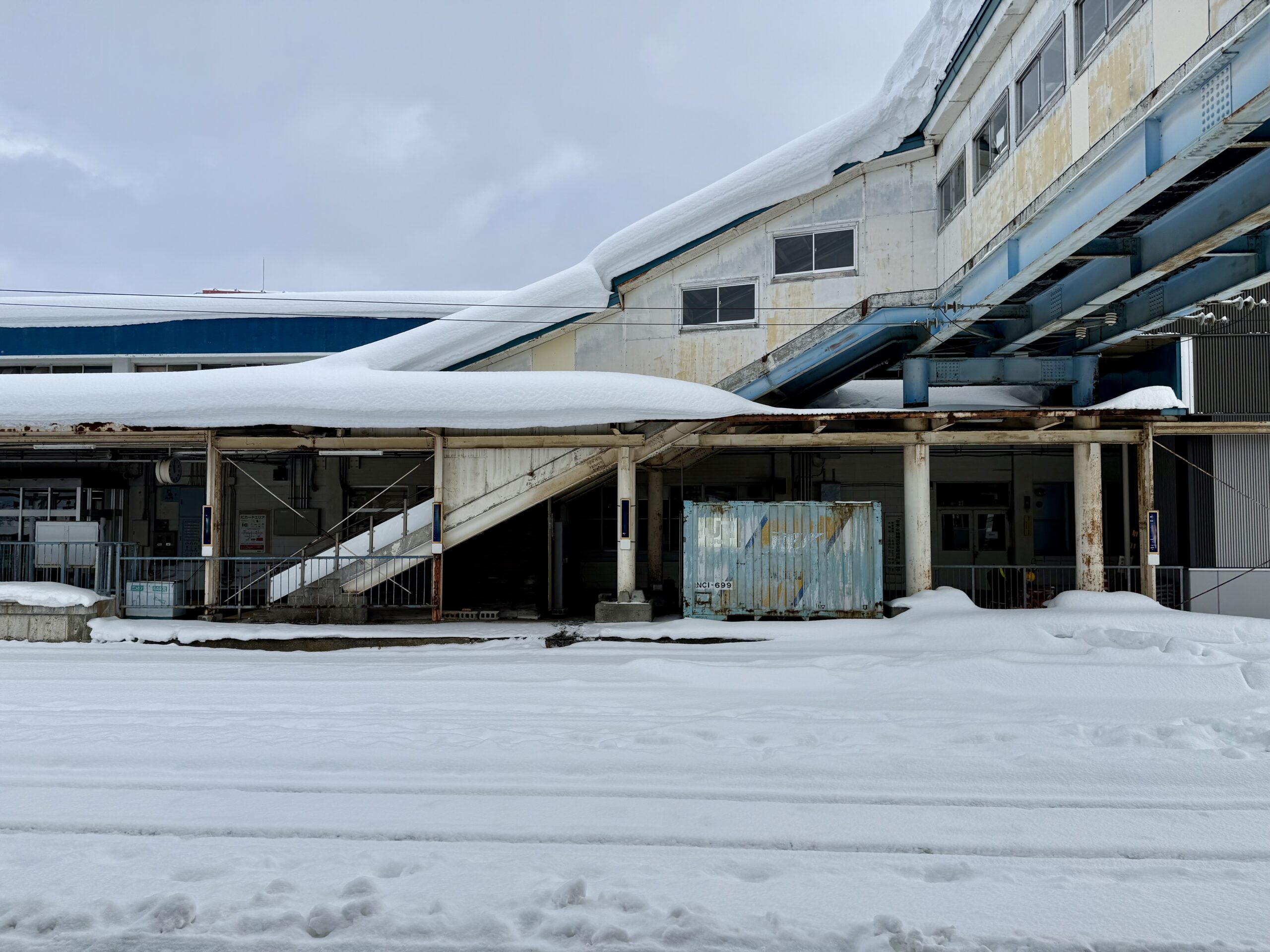 雪は屋根を丸ごと飲み込み、渡り廊下の青い骨組みだけが、冷えた空に浮いている。階段の下は乗客が立ち入らないはずの空間で、無造作に置かれた青いコンテナが、駅の「余りもの」を全部押し込めているみたいに見えた。