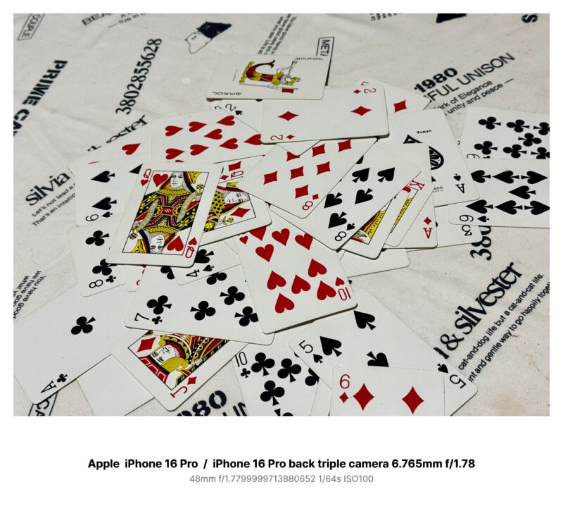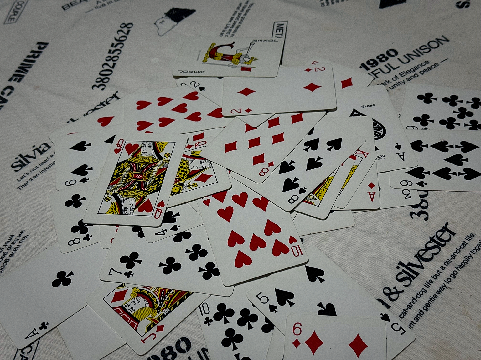散らばっているのに、中心にだけ視線が吸い込まれる。赤い10、赤い8、赤い2。黒い7。まるで誰かが「ここを見ろ」と言わんばかりに、数字が寄せられている。