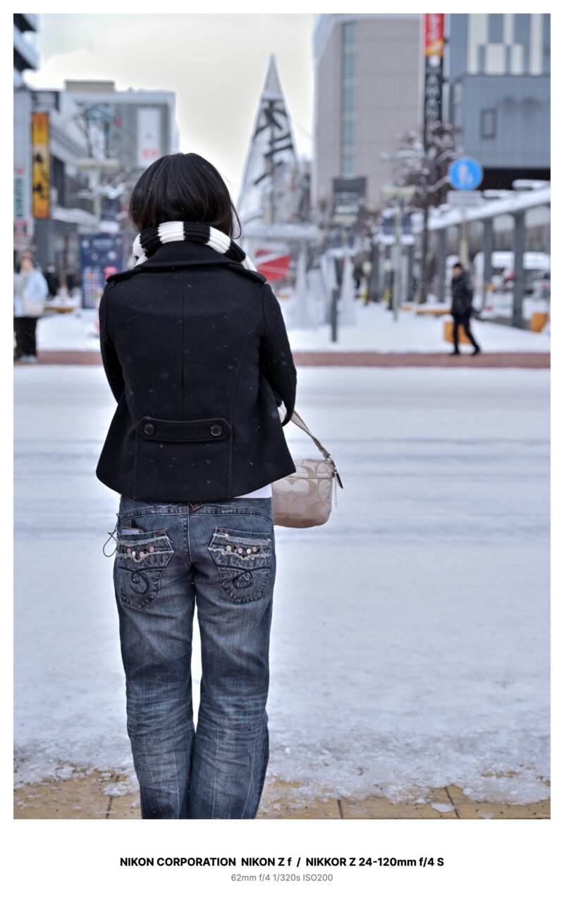 その夜、偶然SNSで同じ交差点の写真を見つけた。冬の街の風景写真。前景に、黒いコートと白黒のマフラーの後ろ姿。奥に尖ったオブジェ。私が見た構図そのままだった。