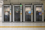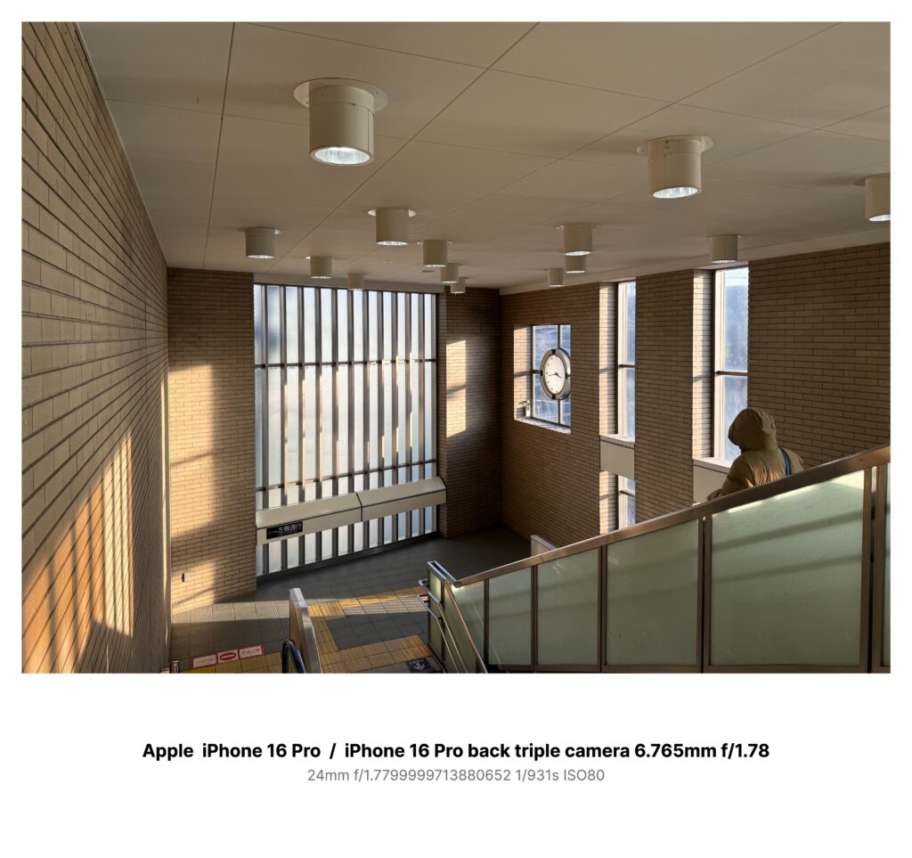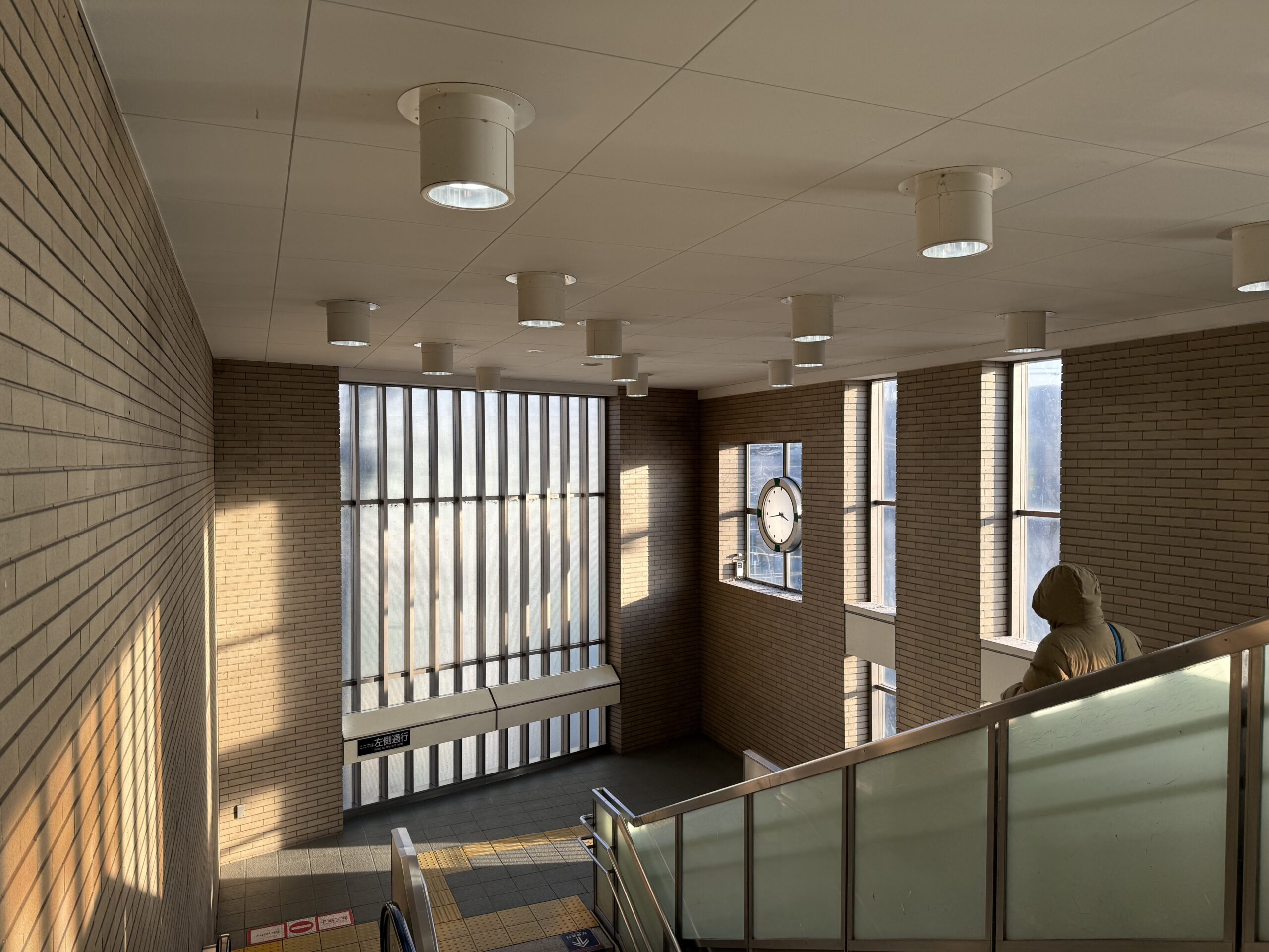 高架化された駅の階段は、明るすぎるほど明るい。改札口のすぐ脇、外へ降りる階段の上に立つと、縦長の窓が並び、午後の光が床に格子を落としている。写真の左側に見えているのは、降りた先の踊り場で折り返す“続き”の段だ。レンガ色の壁、白い天井、円筒形の照明。どれも新しく整っていて、清潔な“日常”の顔をしていた。