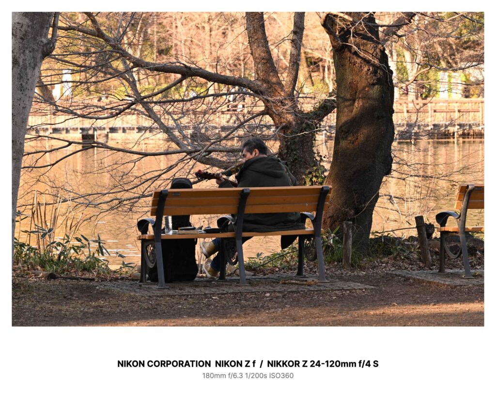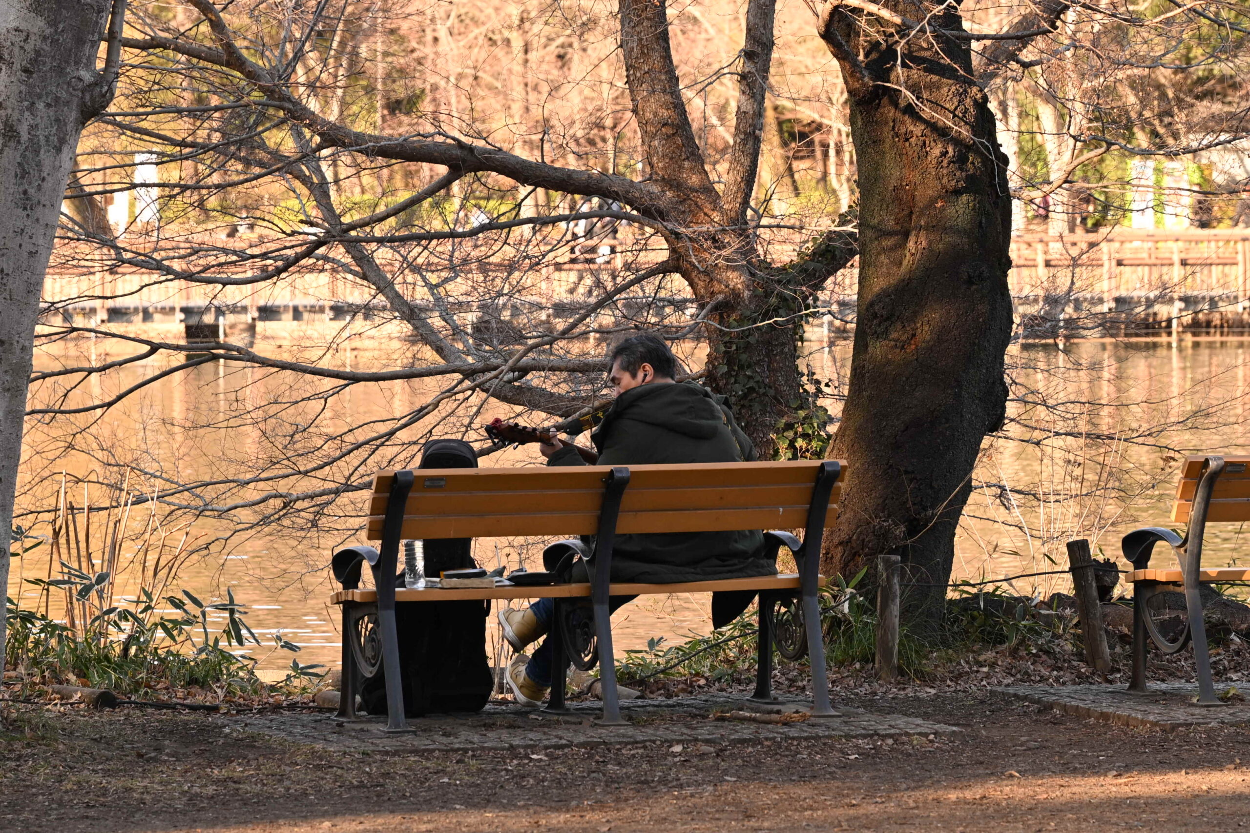 池のほとりのベンチに、ひとりの男が座っていた。深いフードの上着、足元に置かれた黒いギターケース、ベンチの板の端に小さなペットボトル。男はアコースティックギターを抱え、練習している――そう見えた。