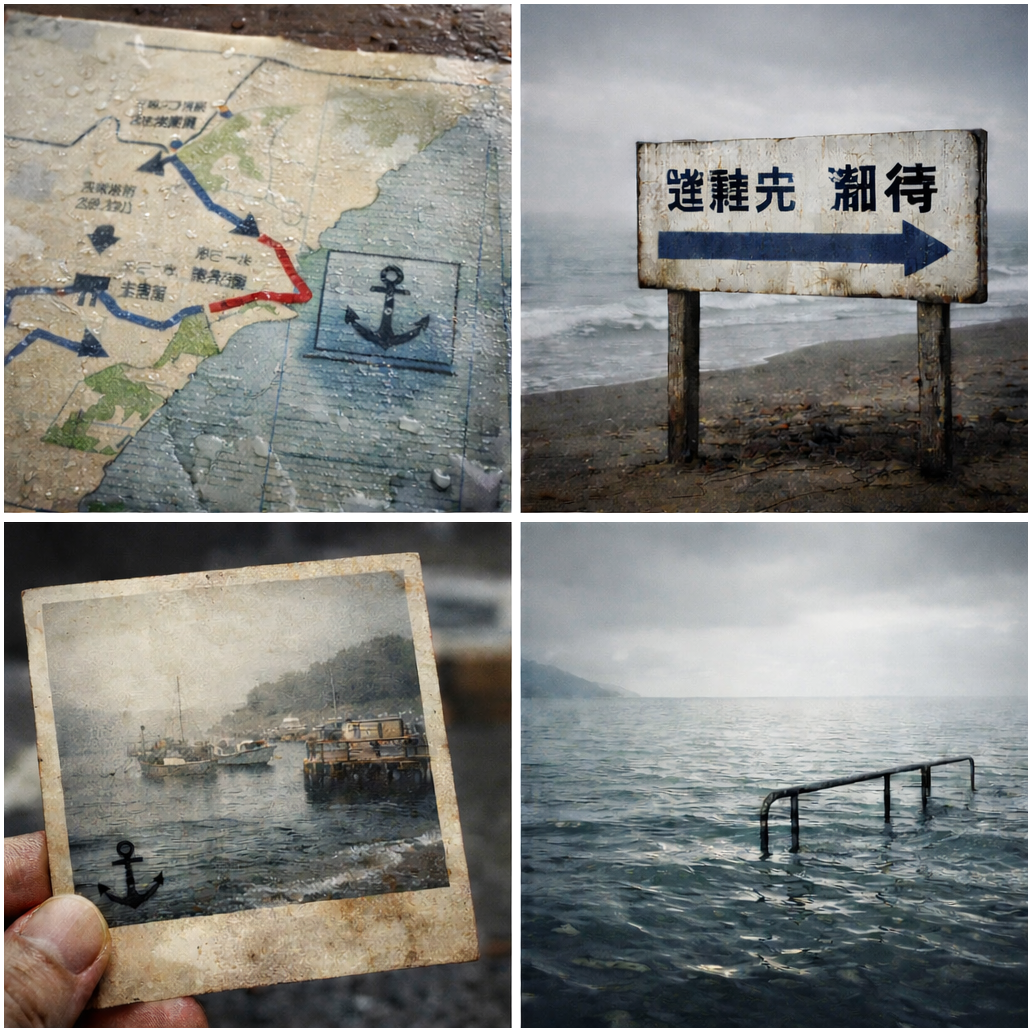 そして、海の上の避難先が刷られていた数軒の家では、そのマップだけがいつの間にか消えました。捨てた覚えはなく、探すたびに家の中の紙は増えるのに、あの一枚だけ見つからない。代わりに引き出しの奥から、見知らぬ港の古い写真が一枚だけ出てくるようになったそうです。