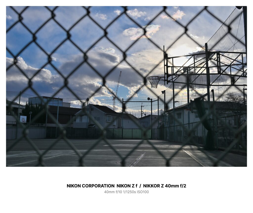 その学校の外周には、背の高い金網フェンスがある。夕方になると、校庭の奥まで見渡せるはずなのに、目はいつも同じ場所で止まる。バスケットゴールの黒い影と、コートを分ける緑の防球ネット。空は白く、雲は厚く、光だけが鋭い。