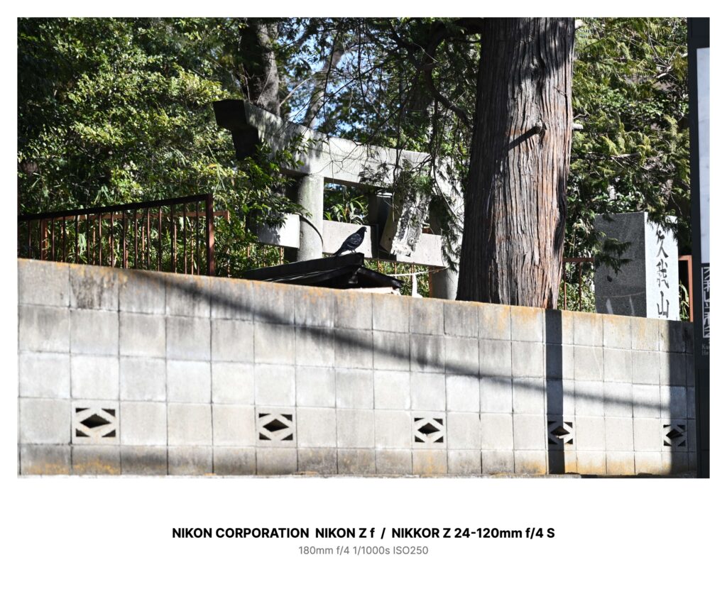 陽が強く、塀の上には鉄柵と濃い緑。さらにその向こうに、石の鳥居の横木が見えた。