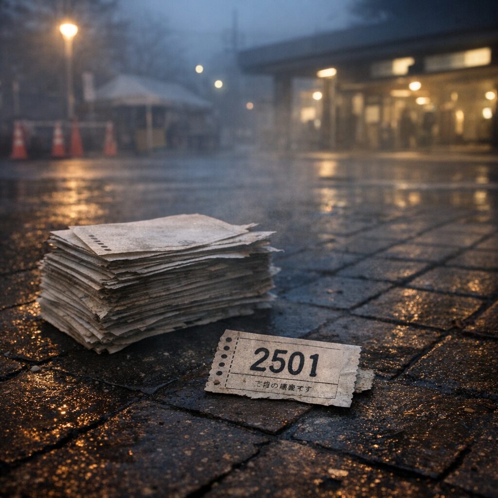 午後、催しは予定どおり終わったそうです。けれど片付けの後に、駅前広場の植え込みから、未使用の整理券の束が見つかりました。封も切られていない新品の束で、先頭には「2501」と印字されていた。束の最後は、なぜか「2500」ではなく、同じ「2501」だったといいます。