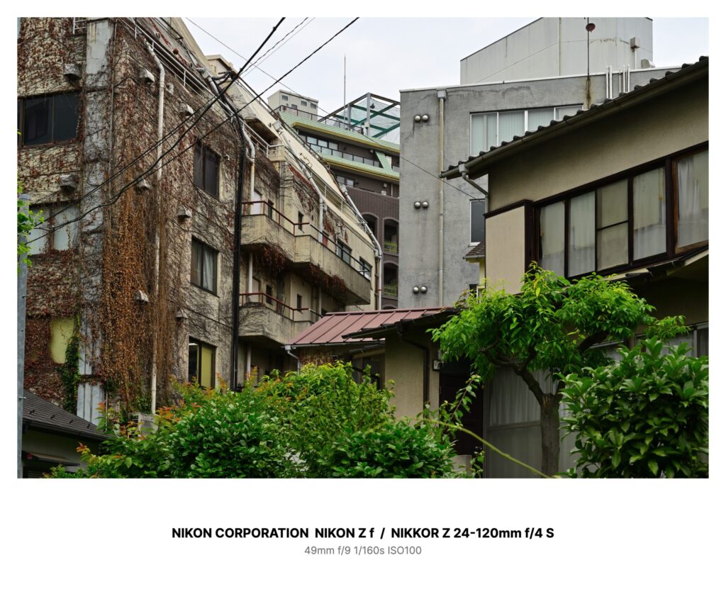 写っているのは、うちの建物と、向かいの家と、その間の路地。蔦の壁、古いバルコニーの影、右手の家の黄ばんだカーテン、手前の青い若葉。まさに毎朝見ている風景なのに、写真の空だけが「足りていない」。電線の交差点のあたりに、縦に削られたみたいな空白があった。