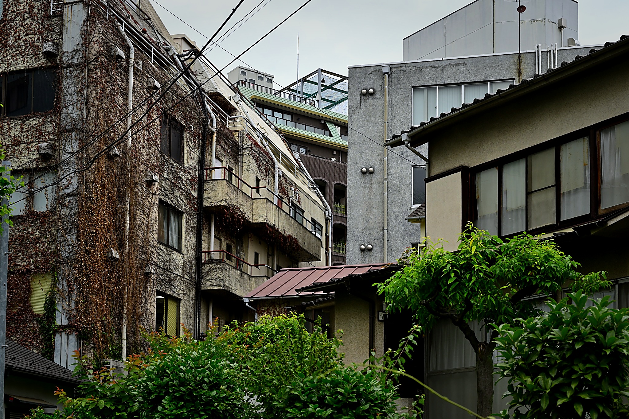 空白はない。代わりに、電線の交差点に小さな結び目がはっきり写っている。そして蔦の壁の濡れた部分の手前——外廊下の影に、こちらを見返す顔がある。首元には、蔦の痕と細い線の痕が、きっちり結ばれた形で残っていた。