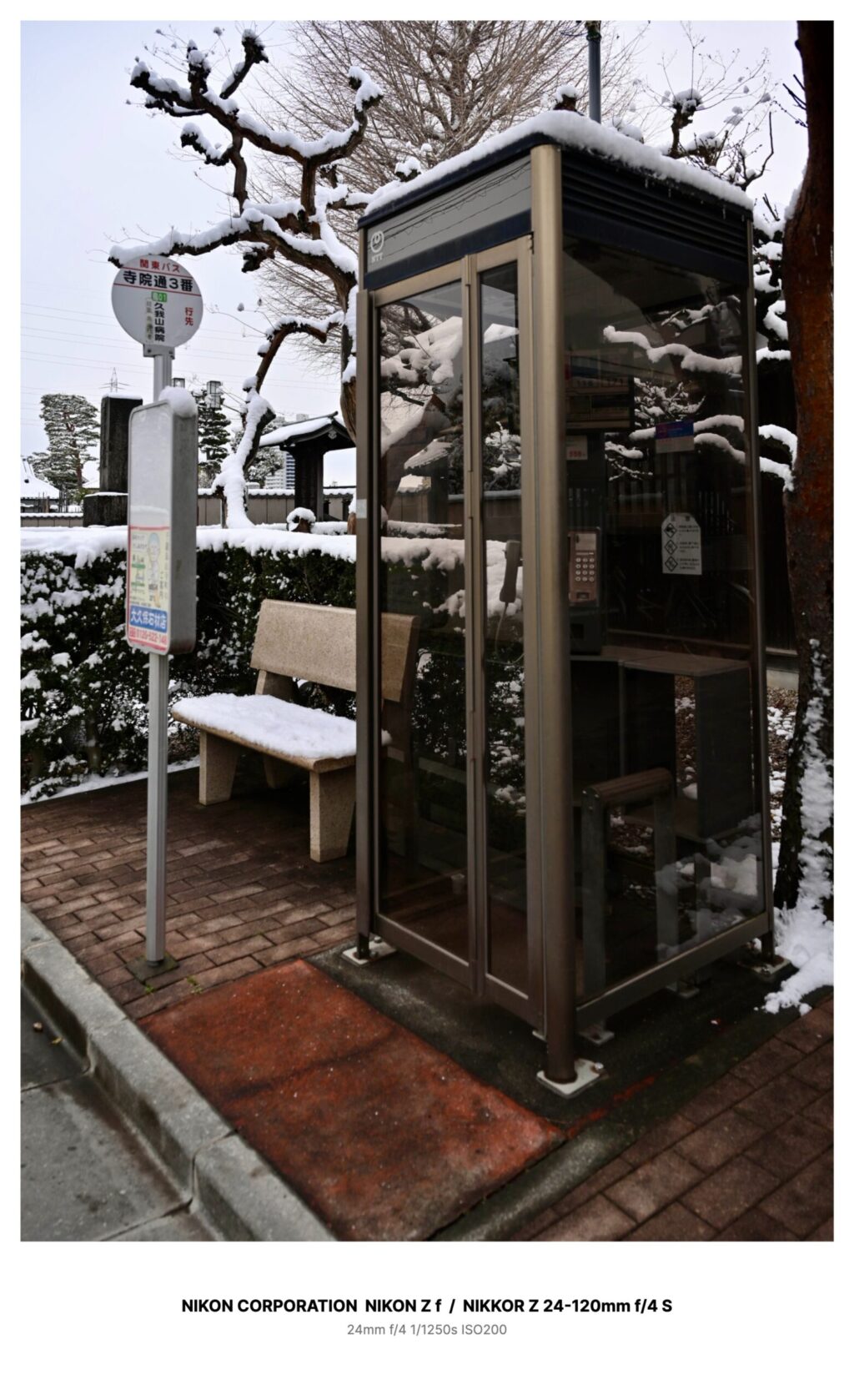 寺院が集まる一帯を抜ける途中、「寺院通3番」というバス停の標識が見えた。下には時刻表のケースがぶら下がっていて、透明な板の内側にうっすら曇りが張りついている。ベンチの座面にも、粉砂糖みたいな雪が薄く載っていた。