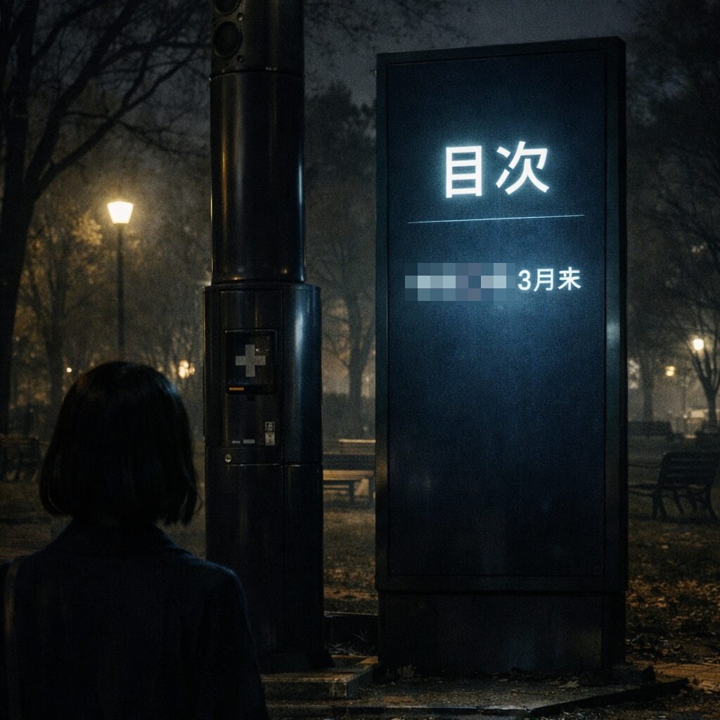 次の瞬間、文字は消え、代わりに何段もの行が現れました。住所の列です。番地まで細かく、改行しながら増えていく。どれもこの区のものらしく見えるのに、どれひとつ“公園”とは関係がない。画面はすぐに黒へ戻りました。