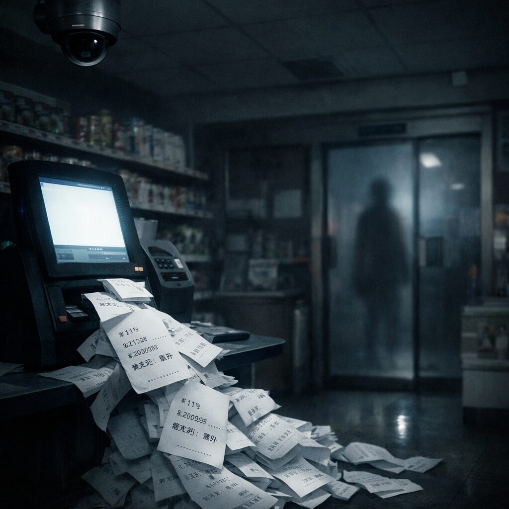 店は狭く、隠れる場所がありません。冷蔵ケースの裏にも、段ボールの影にも、人が立てる余地がない。それでも端末は、“会計の続きを待つ”ように合計金額を表示し続けます。