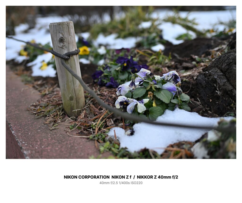 名前の分からない紫や白の花が、急な雪で荒れている。