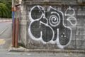塀の角。黒塗りの落書き。白縁の線。渦。点。