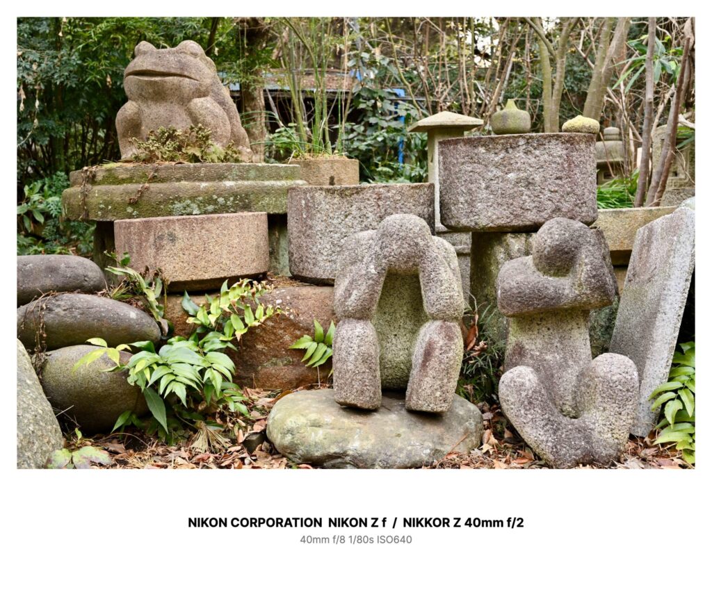端の一角だけ、空気が違う場所がある。輪切りの石や石臼みたいなものが積まれ、石灯籠が混じり、苔と枯れ葉が挟まった“仮置き”の島。その一番上に、カエルの石像が鎮座していた。妙に口が大きくて、笑っているようにも、飲み込む前にも見える。