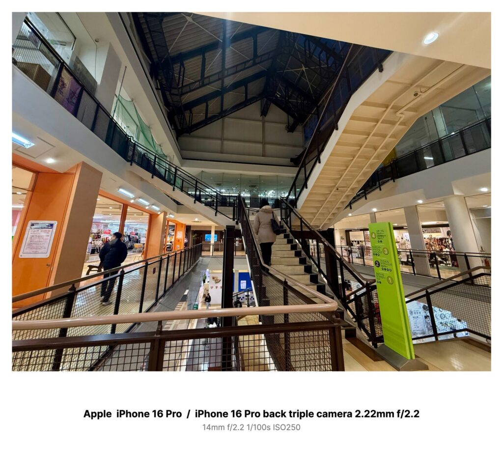 吹き抜けの天井は鉄骨が格子のように組まれ、中央の階段が上階へと伸びている。手すりの網目、床の光沢、オレンジ色の店構え、そしてフロア案内の細長い緑の看板。どれも、見慣れた“明るさ”を前提に設計された景色だった。