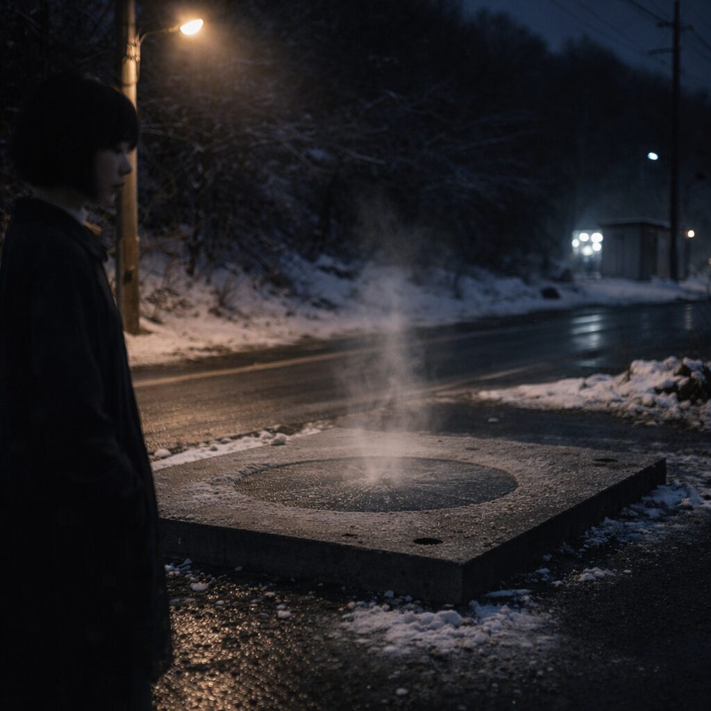 翌日、同じ場所へ行った人もいたようです。けれど自販機は撤去され、台座だけが残っていました。風が抜けるだけの空き地なのに、地面の一点だけが乾かず、丸い輪の形に霜が残っていたといいます。指を近づけると皮膚が吸い付くように冷たく、輪の内側からだけ、ゆっくり白い息が立ったそうです。