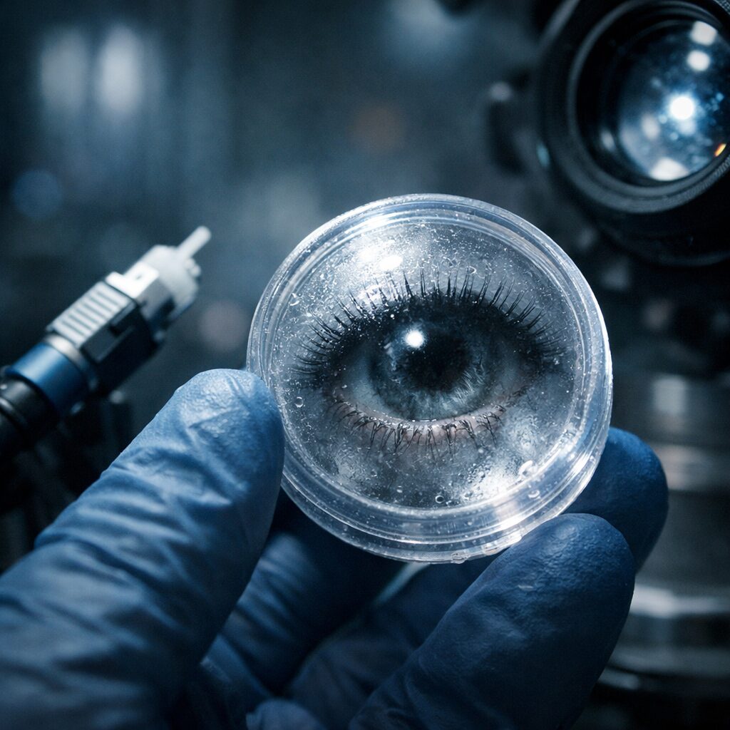 輪の内側――透明であるはずの部分には、黒ではないものが現れたそうです。点ではなく、丸い膜。薄く、湿って、光を返し、中央に小さな陰を抱える。瞳孔のような陰が、こちらの照明を嫌うように、わずかに縮んだ、と。