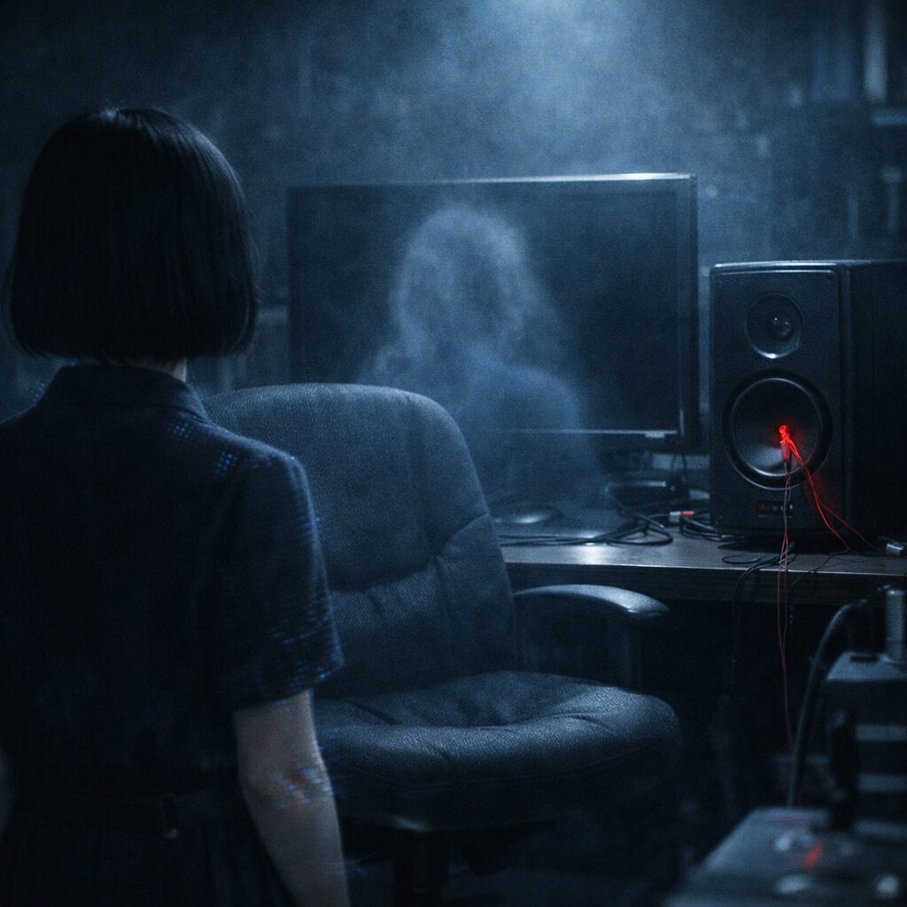 画面の文字は整っていたのに、スピーカーから出た声だけが、少し遠く、天井の角に寄って聞こえたそうです。誰かが壁の向こうで囁いているみたいに。音量を上げても近づかない。むしろ、こちらが近づくほど、声は“背後”へ回り込んだ、と。