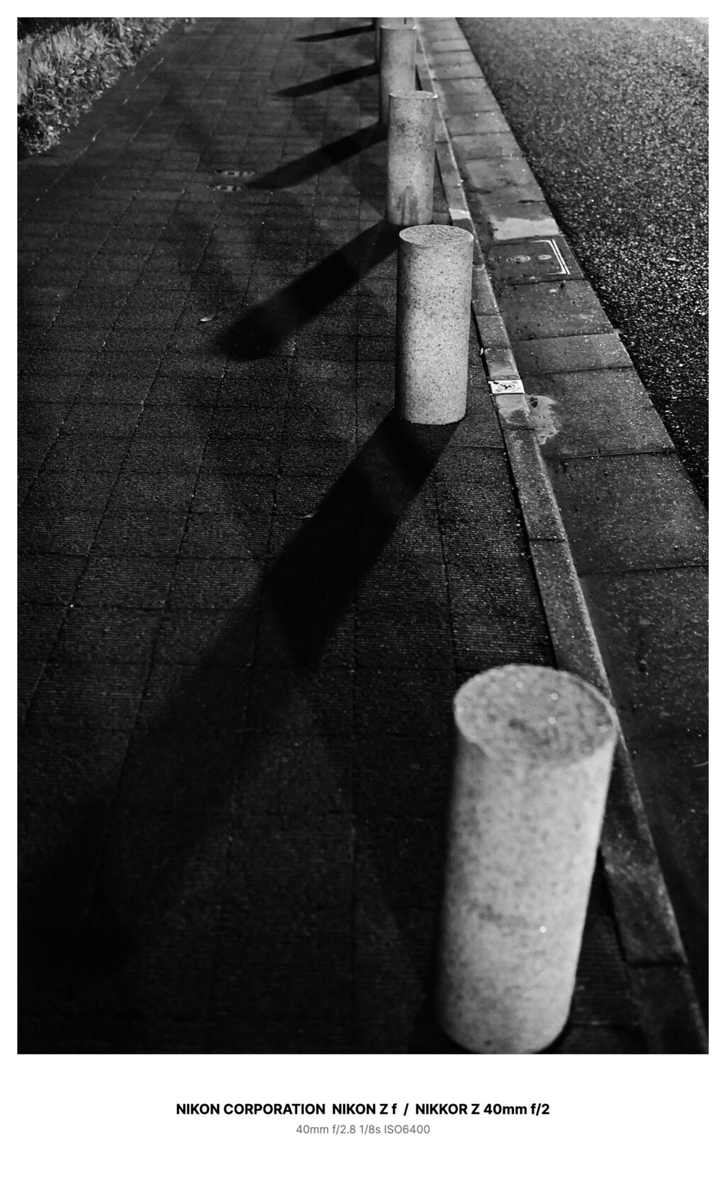 歩道と車道の境目に等間隔で並ぶ、コンクリートの杭。モノクロの画面では、杭よりも影のほうが主役に見えた。