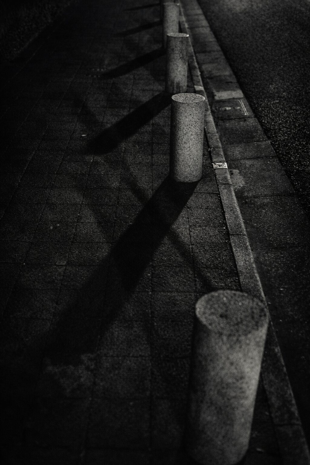 歩道と車道の境目に等間隔で並ぶ、コンクリートの杭。モノクロの画面では、杭よりも影のほうが主役に見えた。
