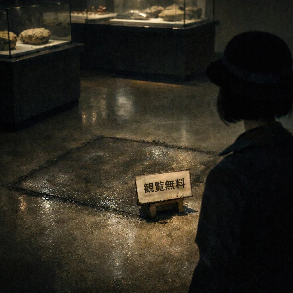 紙を留めていたクリップだけがあり、札だけがない。代わりに、展示室の床の中央寄りに、あの四角が一度だけ現れたと聞きます。展示ケースがもう無いのに。角は直角で、辺はまっすぐで、床は乾いているのに濡れたように光った。