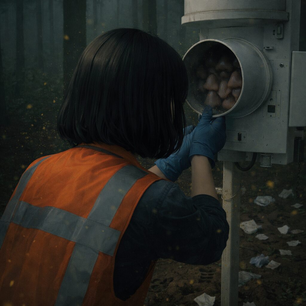 保守員は脚立を降りようとしました。けれど、その前に、観測箱の中で何かが擦れる音がしたといいます。羽虫でも枝でもない、もっと柔らかいものが、内側から網をなでるような音。気になって、もう一度だけ覗いてしまったそうです。