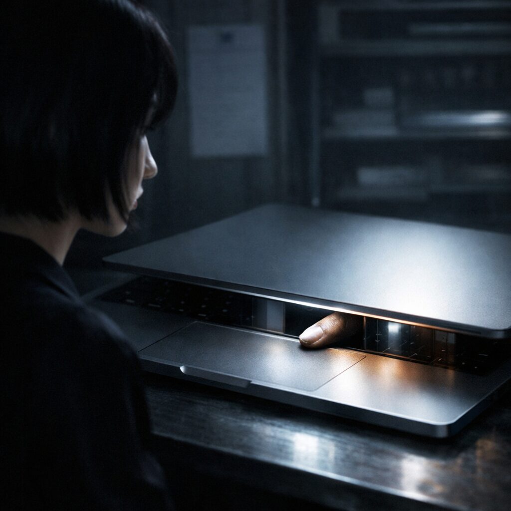 慌てて蓋を開けると、画面は真っ黒だったそうです。十三インチの表示面には何も映らず、キーボードも、淡い色のまま整っている。けれど、掌を置くあたりのアルミには、内側から押されたような小さなふくらみが五つ、並んでいたといいます。へこみではなく、ふくらみです。叩いた跡が、逆向きに出ていたそうです。