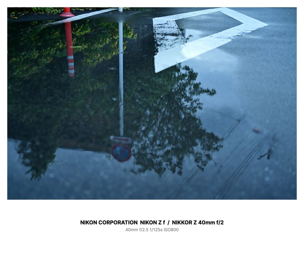 雨上がりの夕暮れ、路地の角に大きな水たまりが残っていた。