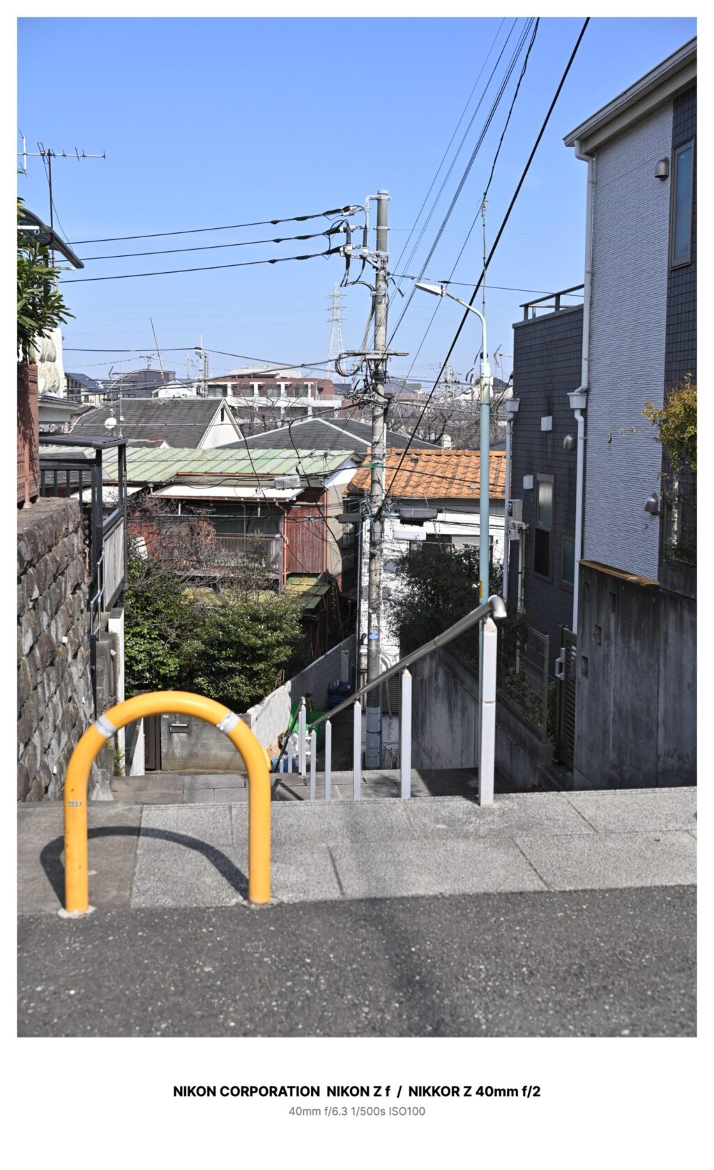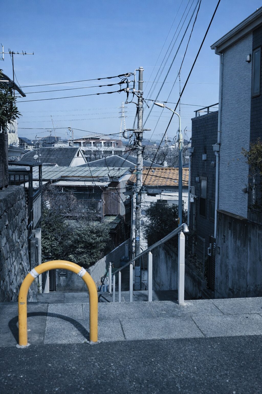 引っ越してから最寄り駅へ出るには、家の脇を落ちるあの階段がいちばん早かった。石垣と外壁に挟まれた細い下りで、晴れた昼は空がやけに青く見える。途中の白い手すりだけが新しく、いちばん上には黄色い柵が立っている。見晴らしのせいか、誰もいないのに、誰かに見下ろされているような気分になる階段だった。