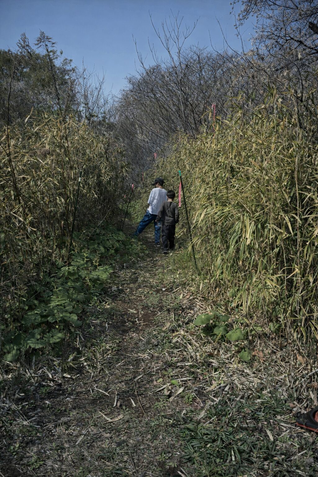 背丈ほどの笹に挟まれた細い道へ、黒い支柱を何本も立てて、桃色のビニール紐を結んでおく。ここから先は入っていい、ここから先はまだ駄目だと、誰にでもわかるようにするための目印だ。
