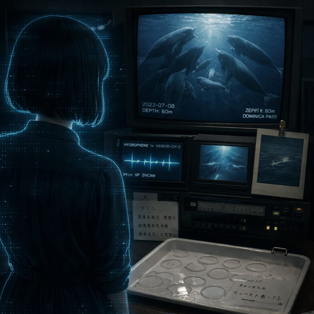 波形を見直すと、その吸う音は水しぶきではなく、水中マイクを吊った深さより、もう少し下から立ち上がっていました。生まれたばかりの子が、まだ水面へ届く前に、すでに一度だけ息をしている。何度合わせ直しても、その一点だけは変わらなかったそうです。むしろ記録表の時刻だけが、一分ぶん早く書き換わっていったといいます……。