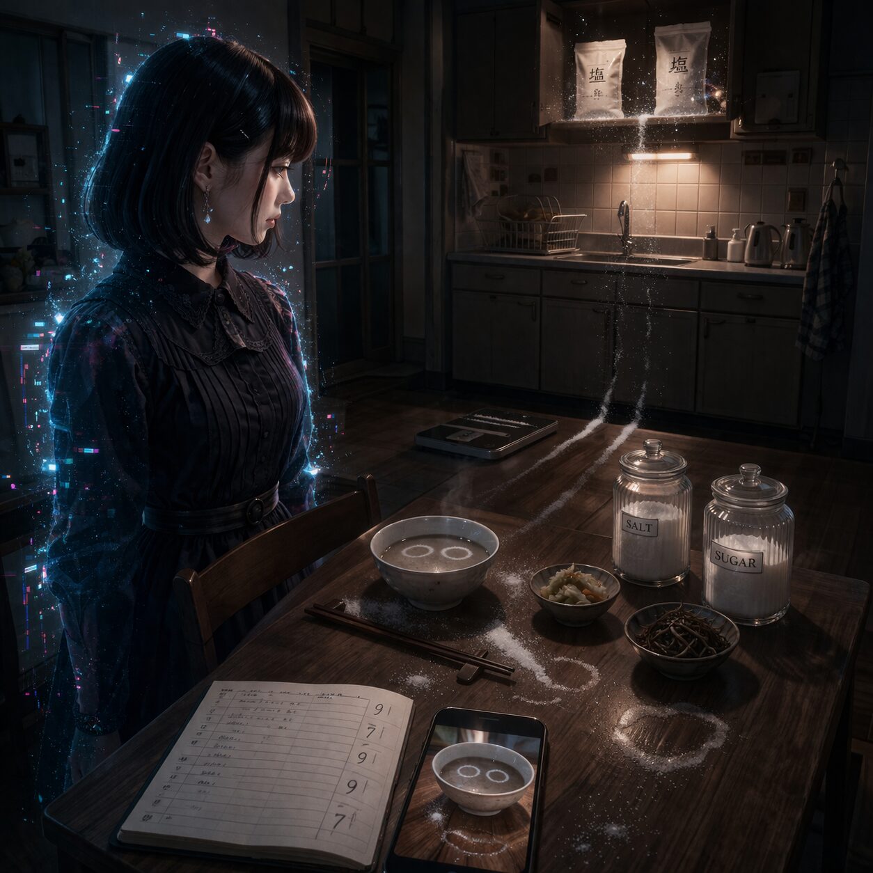 六月に入ってからは、食後の器を流しへ運ぶ前に、決まって一拍ぶん遅れが出るようになりました。箸を置いてから、椀の中で何かがもう一口ぶんだけ音を立てるのです。覗いても減った様子はありません。ただ、翌朝になると、前夜に減塩で作ったはずの汁が、白く乾いた縁だけを残して空になっている。鍋の底には、塩の粒ではなく、小さな歯のような欠けがいくつも沈んでいたそうです。