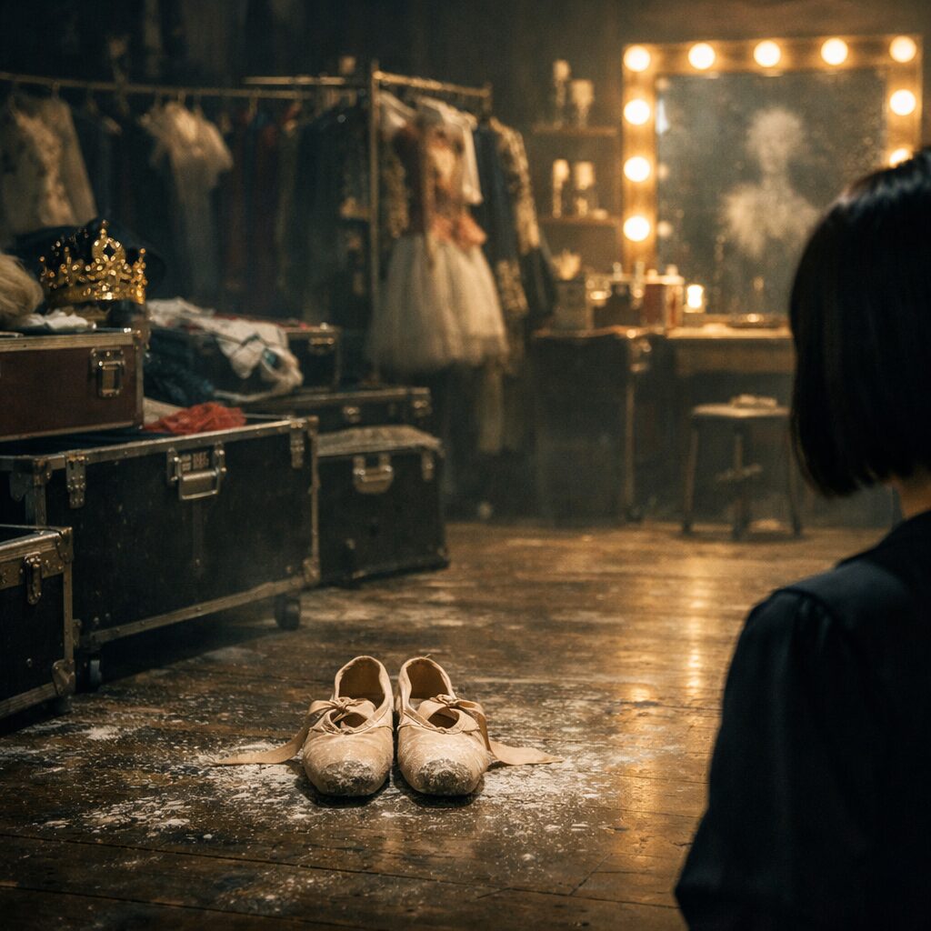 その夜、衣裳係のひとりが、頭飾りの箱の陰に、見覚えのない一足の靴を見つけたそうです。薄い色の稽古靴で、持ち主の札も役名の札も付いていない。ただ、まだ海も越えていないはずなのに、つま先だけが、何度も強く床を押したみたいに柔らかくなっていたそうです。裏には白い粉がわずかに付いていて、保管庫の床と同じ細かな粒が、左右きっちり揃っていたといいます。