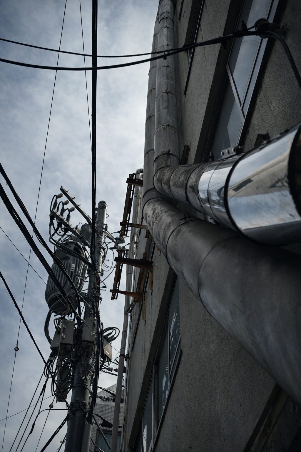 車の音も人の足音も聞こえていたのに、頭の真上の電気だけが抜け落ちた感じだった。思わず見上げると、外壁をまっすぐ上がるいちばん太いダクトに、見覚えのない継ぎ輪が一つ増えていた。錆びた支持金具のすぐ下、本来なら何もない滑らかな胴の途中に、帯のような段差ができていた。