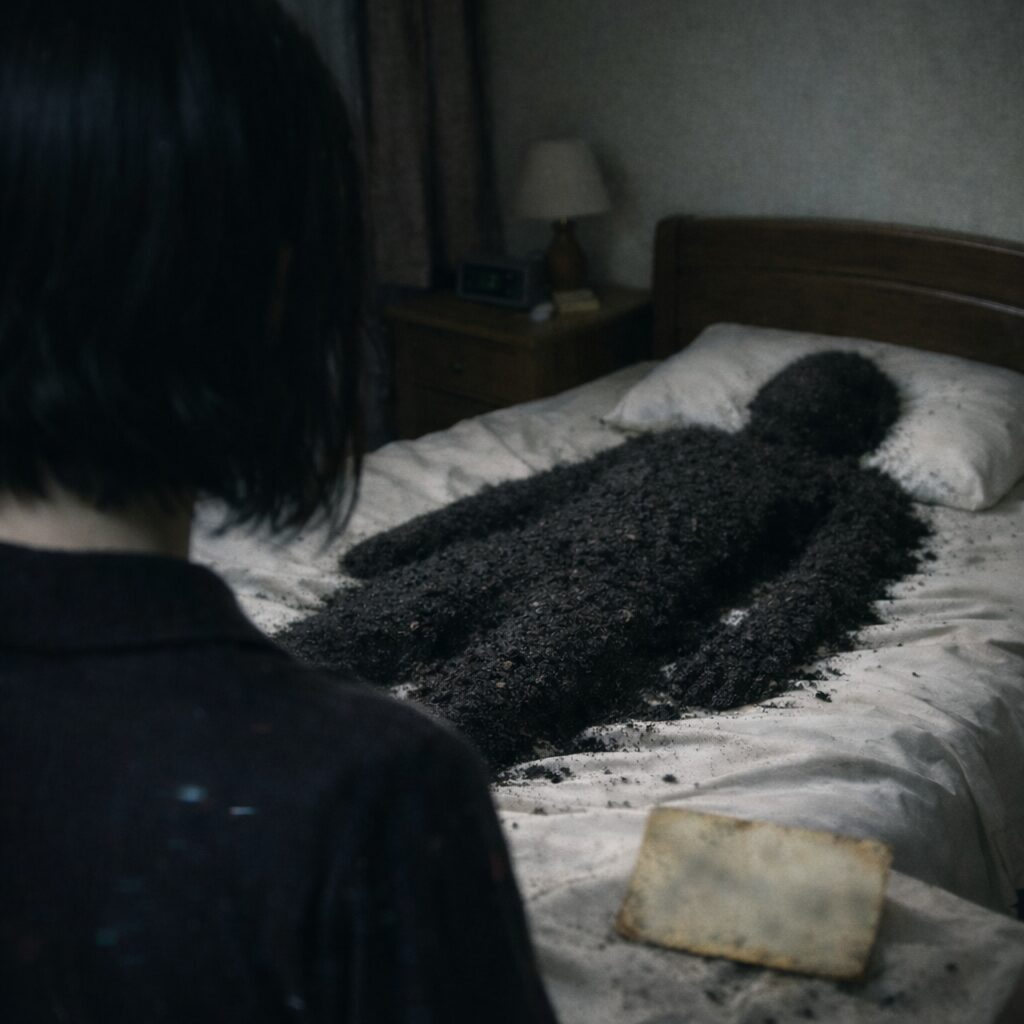その家で最初に落ち葉を集めた人は、その夜、いつも通りに寝たそうです。翌朝、布団の上掛けは胸のあたりまでふくらんだままだったのに、その下に人の身体はなかったといいます。代わりに、敷布団の上には黒い土が人ひとりぶん、仰向けに寝ていた形のまま残っていたそうです。厚みは三インチほど。顔のあるはずの位置は浅く沈み、肩、腕、腰、膝の輪郭まで、不自然なくらい整って見えたといいます。