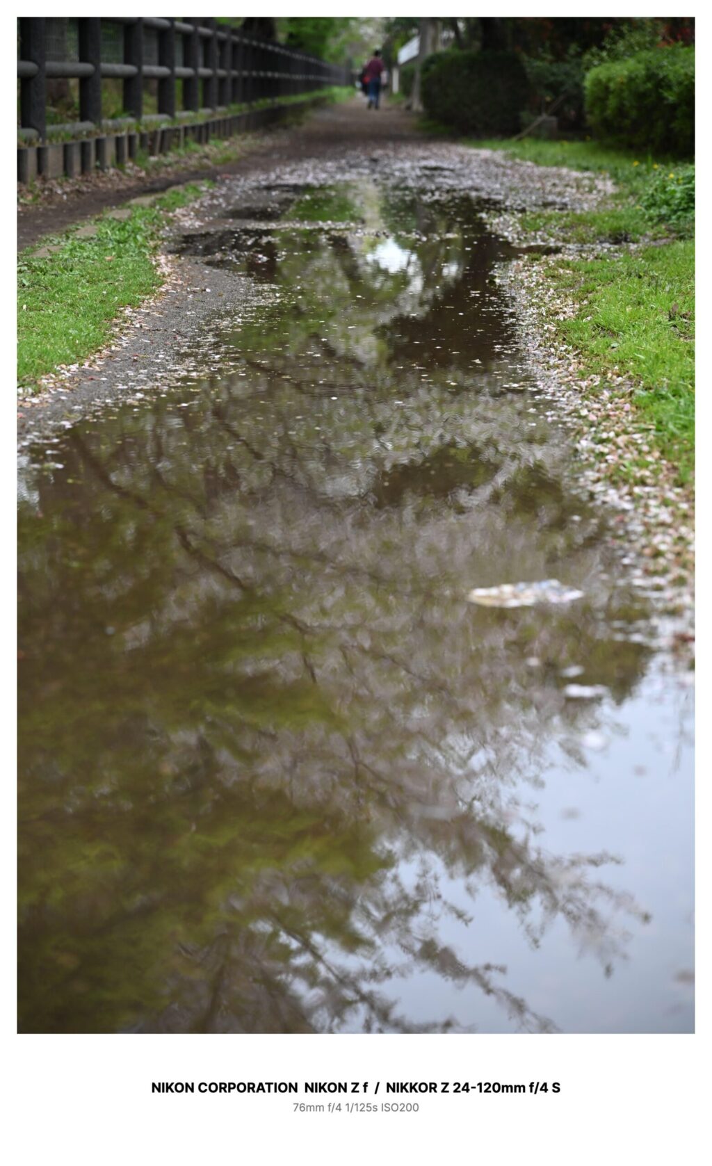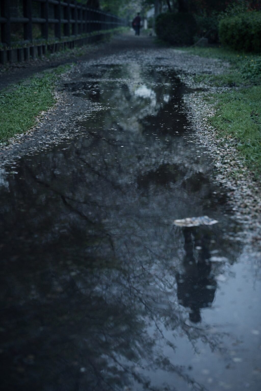 雨の翌日の昼、その緑道には細長い水たまりがよく残る。柵と植え込みに挟まれた道いっぱいに水が広がり、散った桜が縁へ白く寄る。最初におかしいと思ったのは、向こうから誰かが来るのを、水面の中で先に見た時だった。