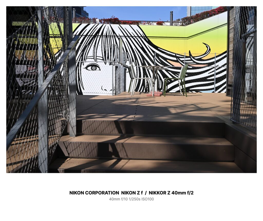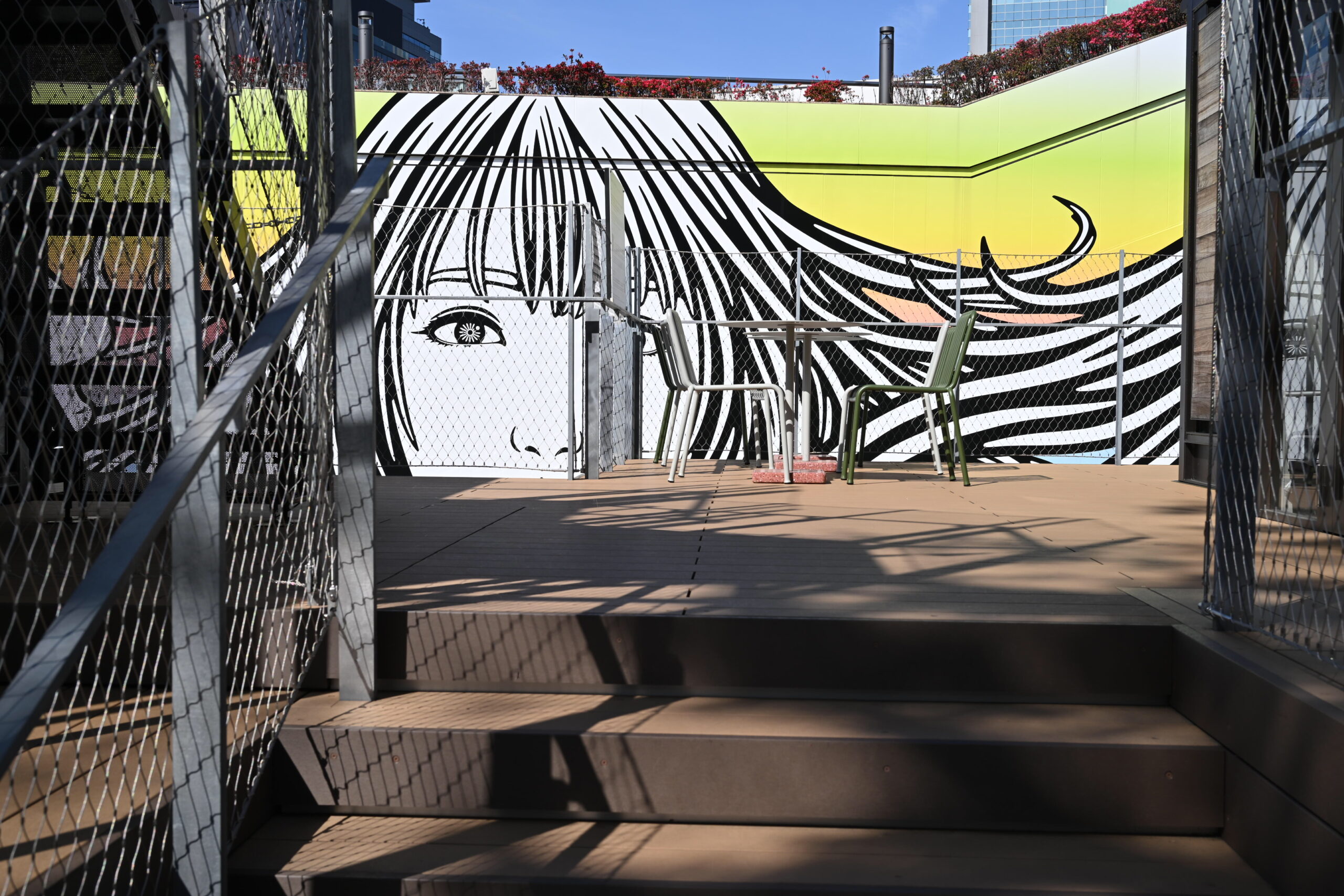 金網の手すりに挟まれた短い階段を上がると、木の床の先に小さなテーブルと椅子が二脚だけ置いてある。その向こうの壁一面には、女の顔の壁画が描かれていた。片目と鼻先だけが見える、不機嫌なのか無表情なのか判別しにくい顔で、黒い髪の線だけが風に煽られたみたいに壁いっぱいへ流れている。