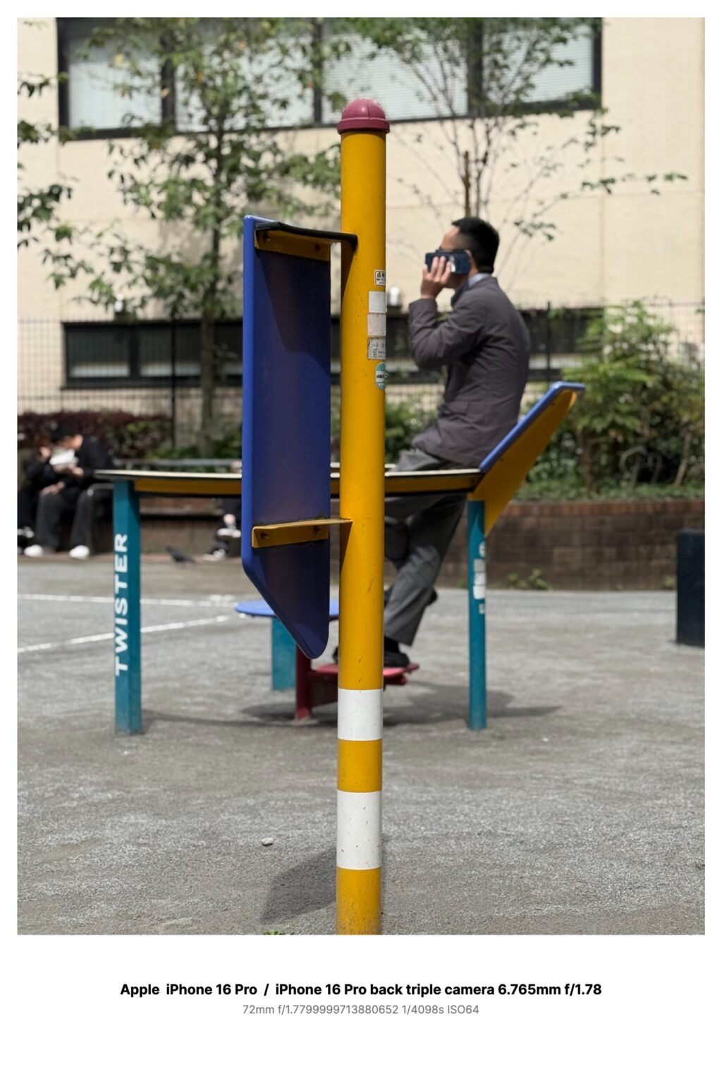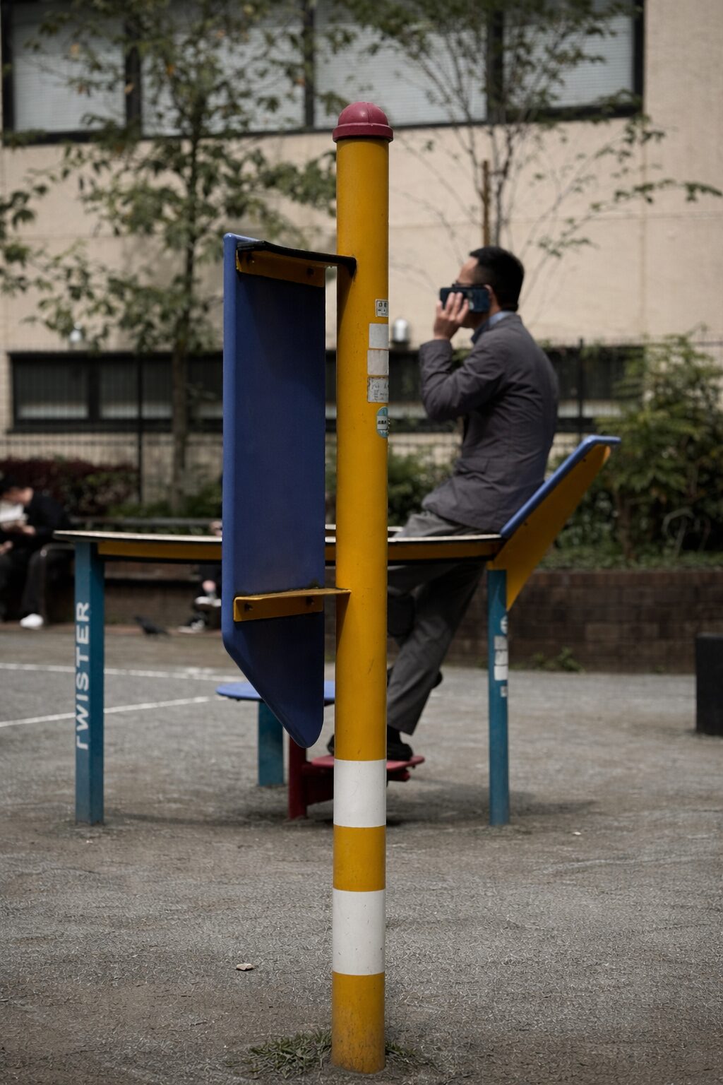 子ども向けの回転遊具なのに、男はいつも背筋を伸ばしてそこへ腰かけ、片手でスマートフォンを耳に当てたまま、低い声で中国語を話し続ける。近所では少し有名だった。散歩中の老人も、保育園の迎え帰りの母親たちも、「またいる」と言う。雨の日はさすがに見ないが、曇りでも晴れでも、だいたい同じ時刻になると現れる。誰かと通話しているらしいが、笑い声も怒鳴り声もなく、ただ一定の調子で、同じ長さの言葉を何度も区切るように話していた。
